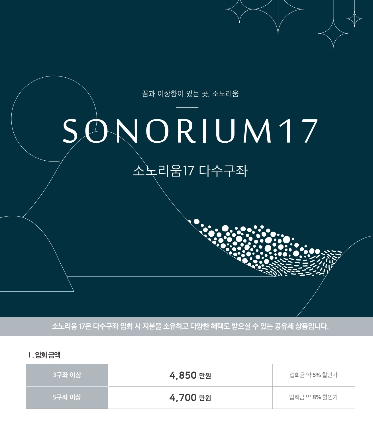 오늘은 국내 최대 규모의 레저 인프라를 자랑하는 소노호텔앤리조트(구 대명리조트)에서 새롭게 선보이는 프리미엄 멤버십, '소노리움(SONORIUM) 17' 법인 공유제 분양 소식을 전해드립니다.